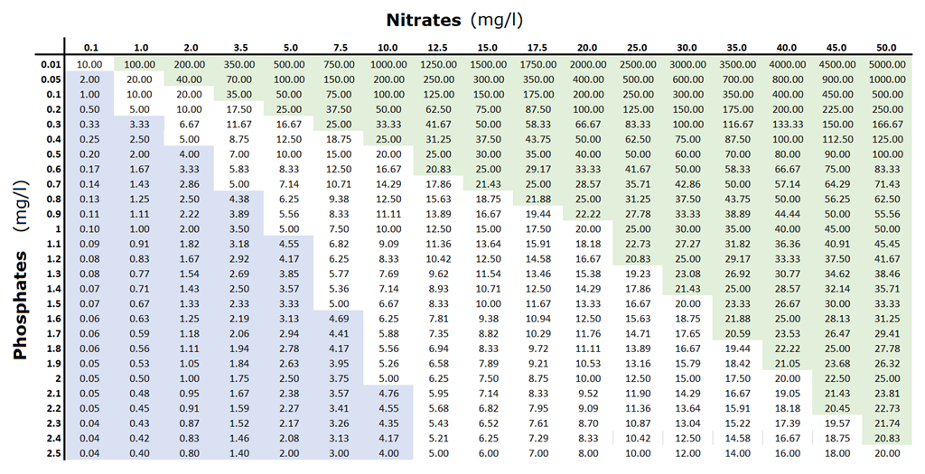 Als de verhouding naar fosfor neigt (blauwe zone), waardoor het fosfaatgehalte te veel stijgt of het nitraatgehalte te veel daalt, kan er gemakkelijk een wildgroei van blauwgroene algen (cyanobacteriën) ontstaan.