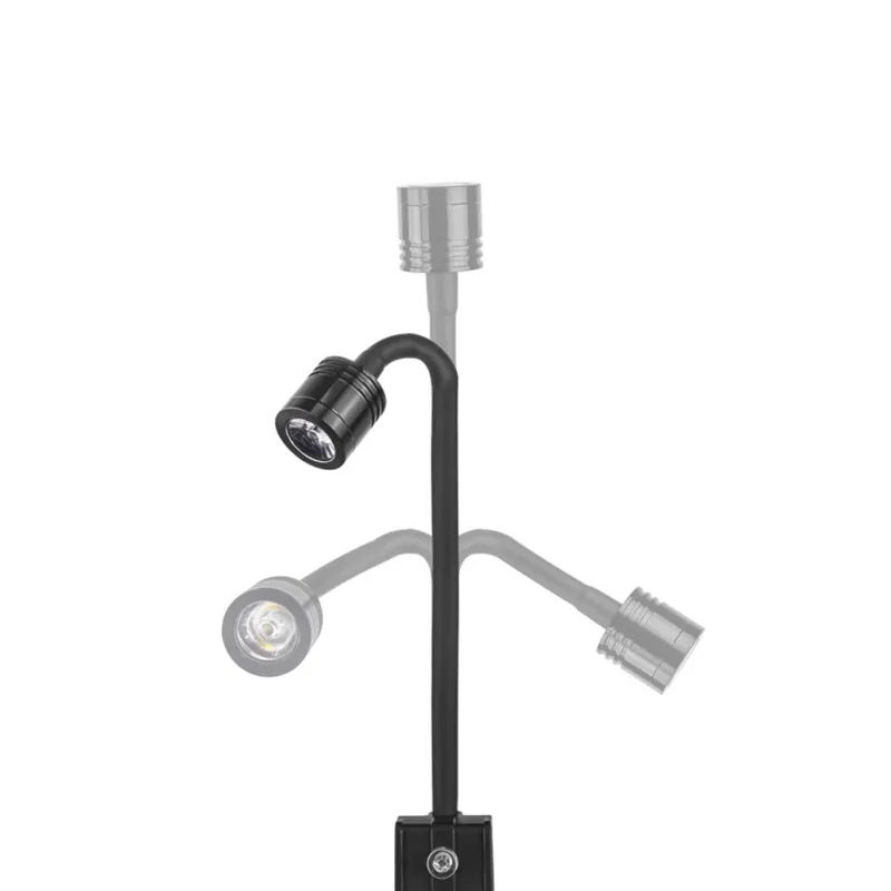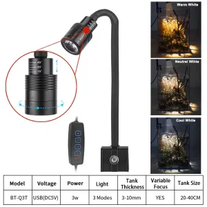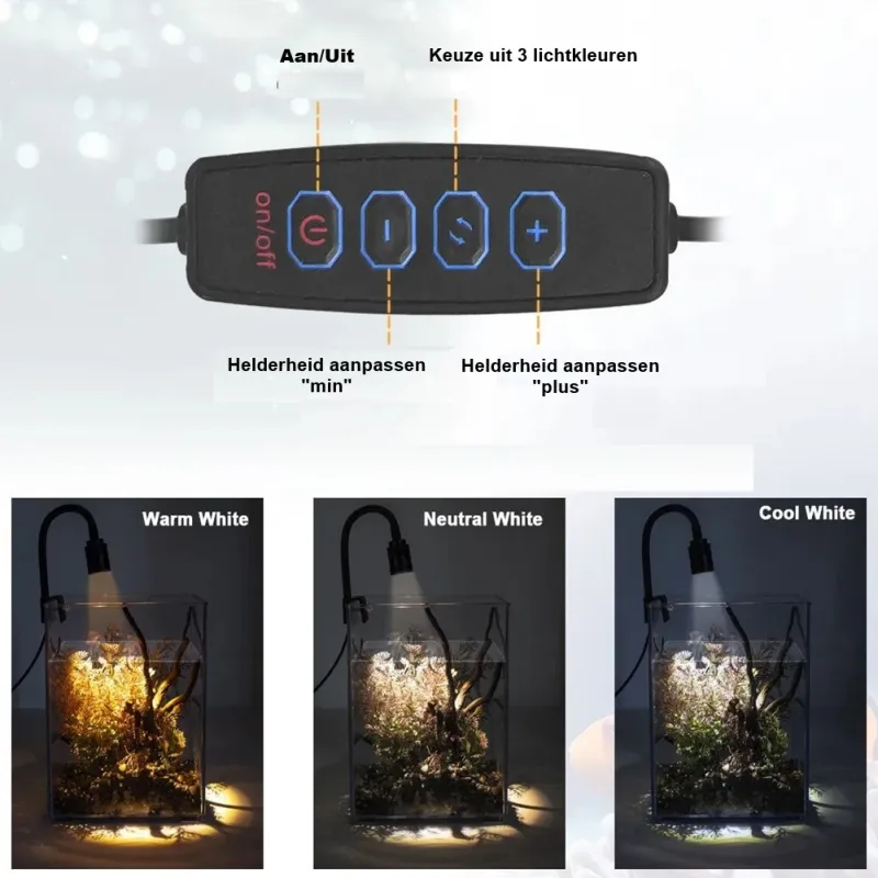 LED Downlight. Ideale kleine LED met flexibele arm. De verlichting is instelbaar in 3 tinten (daglicht, koelwit en warmwit). De sterkte is instelbaar in 10 standen en de stralingshoek is instelbaar tussen de 10 en 45 graden. De klem past op glasdiktes van 3 tot 10mm. Het stroomverbruik is maximaal 3 Watt. Wordt geleverd zonder usb adapter, deze is los mee te bestellen. De LED is niet waterdicht en is alleen geschikt voor open aquaria of paludaria.
