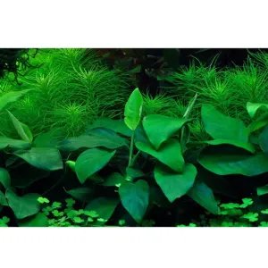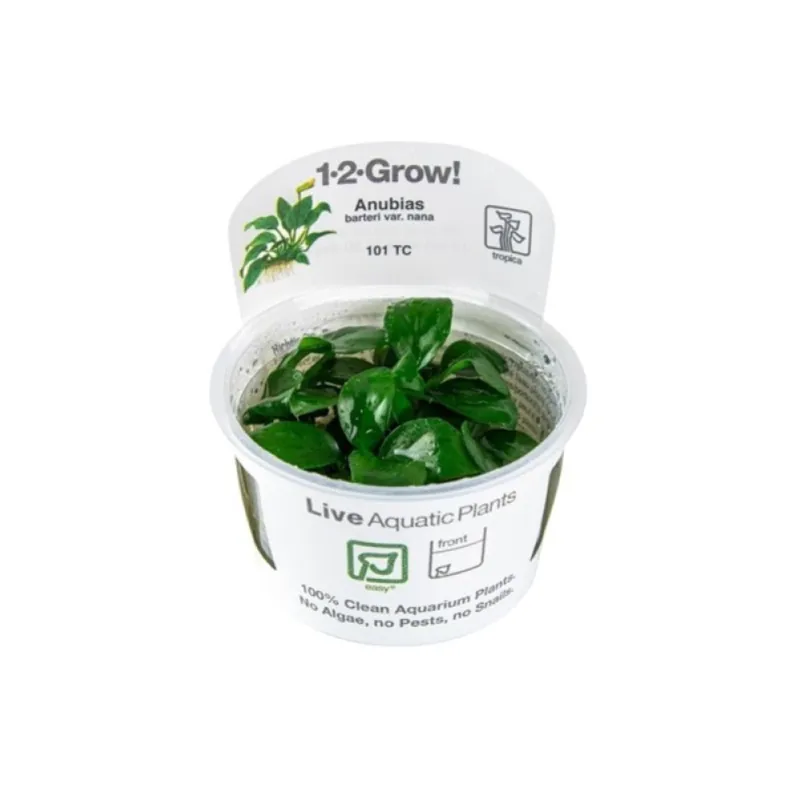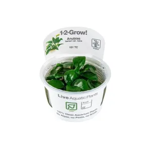 Anubias barteri var. nana is een compact groeiende variant van de anubias barteri, De anubias groeit goed in uiteenlopende omstandigheden. Hij komt oorpsronkelijk uit Kameroen en wordt zo'n 5 tot 10 cm groot. Het rizoom bereikt ook een lengte van 10cm of meer. Anubias groeien langzaam en de bladeren gaan enkele jaren mee. Ze groeien goed als epifyt op de hardscape materialen en ook vast aan het substraat (begraaf de wortelstok niet!). De kleine bladeren met hun mooie donkere kleur vormen een interessant contrast met andere aquarium planten.