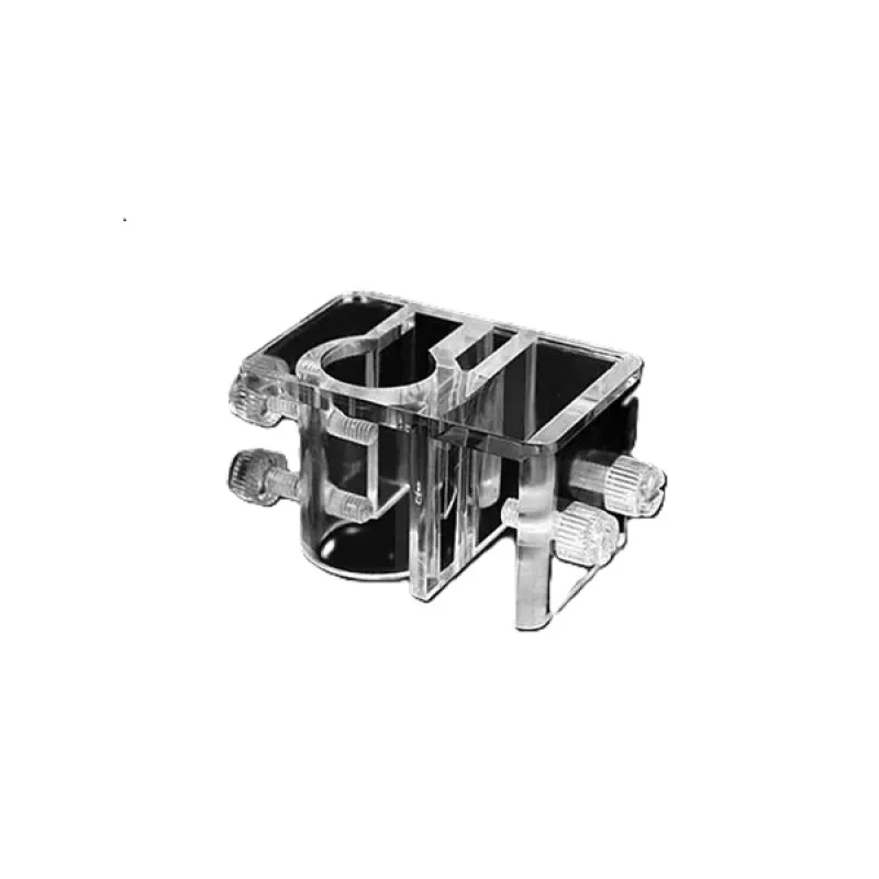 Losse houder voor een RVS in- of outflow buis. Door het gebruik van acryl is de houder onopvallend te monteren op de rand van het aquarium.