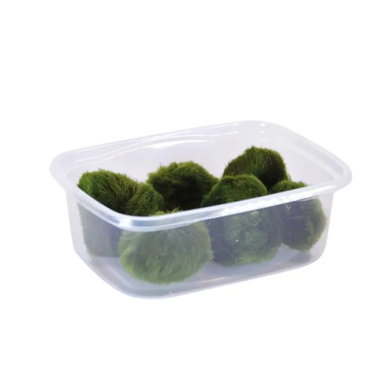 Mosbol supersmall in bakje van 6 stuks. Deze diepgroene mosbolletjes bestaan uit een onschadelijke algensoort. Door de golfslag in grote meren worden deze algen tot bollen gevormd. Zeer decoratief in alle aquaria en ook geschikt voor garnalen. De bollen zijn ook van binnen groen. Deze kleine mosbollen, van 2 á 3 cm, zijn ideaal voor nano en scape aquaria.