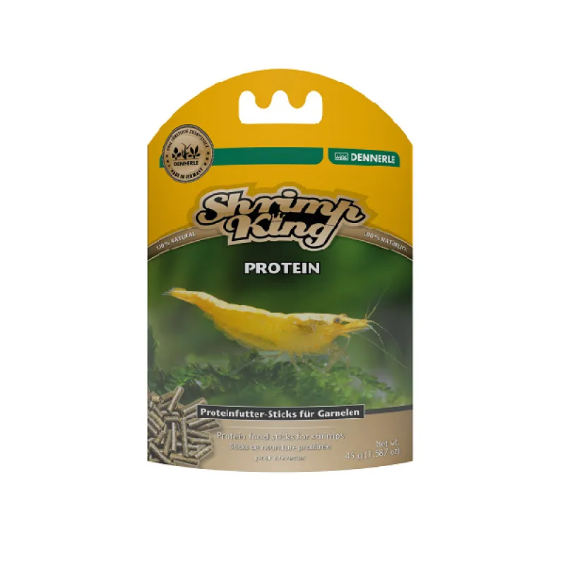Proteïnegehalte 42,2%. Voor tijden met een verhoogde proteïnebehoefte, b.v. tijdens de eivorming. Zinkende, waterstabiele voer sticks van 100% natuurlijke ingrediënten als gerichte aanvulling van proteïnes. Shrimp King Protein bevat met 42,2% een duidelijk hoger proteïnegehalte dan hoofdvoeding. Het wordt binnen het kader van het normale voedingsprogramma gegeven ter afwisseling en als voedingssupplement. Tegelijkertijd is met Shrimp King Protein een verhoogde toediening van proteïnes mogelijk, wanneer er grotere behoefte is, b.v. tijdens de vermeerderingsfase en de eivorming. Ook garnalensoorten met een principieel grotere proteïnebehoefte kunnen zo op passende wijze worden gevoed. De proteïnes en essentiële aminozuren zijn alle voornamelijk afkomstig uit in het water levende voederdieren (vlokreeften, watervlooien, ontschaalde Artemia-cysten, garnalen, groenlipmosselen) en kenmerken zich door een optimale voedingsfysiologische samenstelling en biobeschikbaarheid.