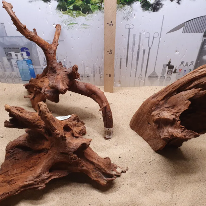 Driftwood zijn stukken hout met een wat grovere vorm. In het begin willen de stukken nog drijven maar door het verzwaren of eventueel inwateren voor gebruik blijven ze prima op hun plaats. Het hout geeft waterverkleuring.