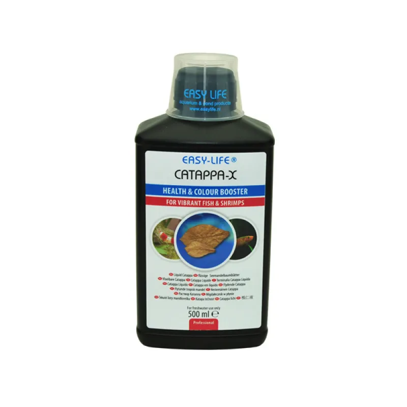 Catappa bladeren worden aan het aquariumwater toegevoegd vanwege de heilzame werking op vissen en garnalen. Catappa-X is de effectieve vloeibare variant hierop.