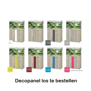 De decorplaat is als accessoire verkrijgbaar in de kleuren Bordeaux, Candy, Lemon, Sky en Urban - een lichte grijstint. De decorplaat is vastgeschroefd en kan natuurlijk ook bij een vol aquarium worden vervangen. Klik hier voor de panelen.
