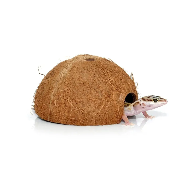 Halve kokosnoot voorzien van 1 gat zodat de vissen of terrariumdieren een extra schuiplaats hebben. Ideaal als natuurlijke broedplek voor kleinere cichliden of L-nummers en reptielen.