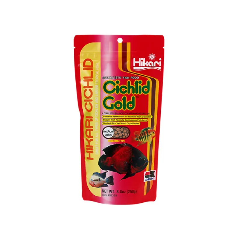 Hikari Cichlid Gold bevat het hoogste mogelijke gehalte aan caroteen, hierdoor komen kleuren zo goed mogelijk tot hun recht. Cichlid Gold is de juiste keuze wanneer een hoog eiwitgehalte noodzakelijk is, zoals bij de meeste carnivore cichliden.