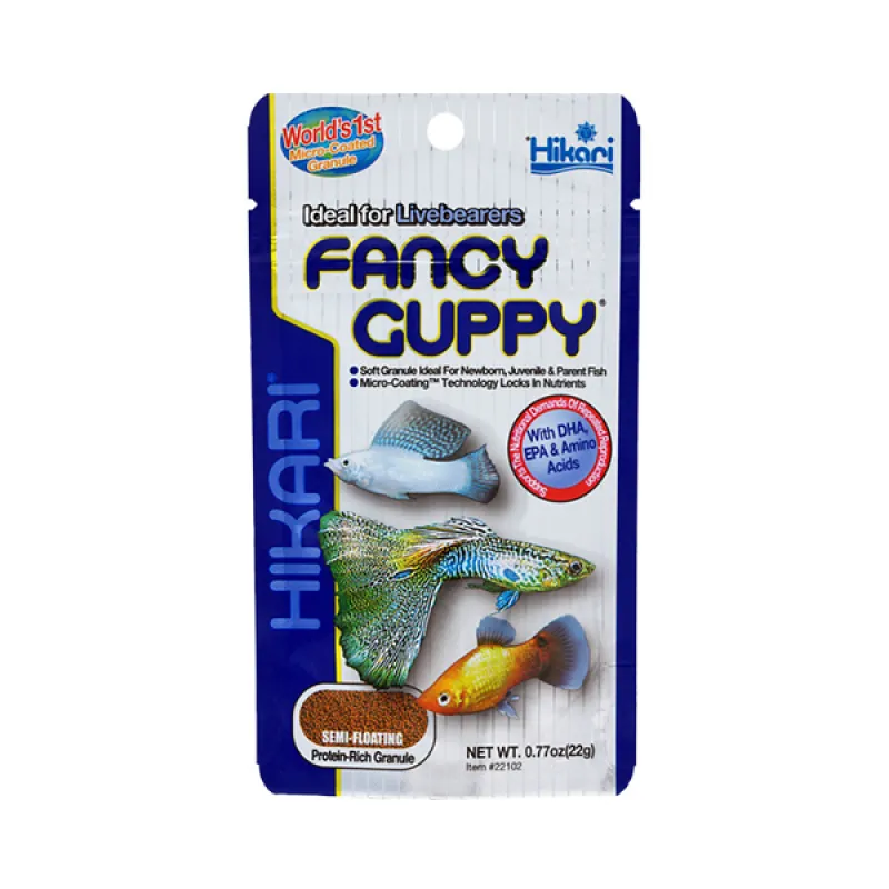 Hikari Fancy Guppy is een dagelijks voer voor levendbarende vissen zoals, Guppy’s, Platy’s, zwaarddragers en Black Molly’s. Dit voer bevat niet alleen krill wat zorgt voor levendige kleuren maar ook chitosan, een natuurlijk ingrediënt dat het immuunsysteem ondersteund. Het is rijk aan linolzuur en jodium voor gezonde groei en ondersteuning van de natuurlijke voortplanting. Hiermee blijven de vissen gezond en in goede conditie. De kleine korrels, zijn voorzien van Micro-Coating en worden snel zacht zonder op te lossen.
