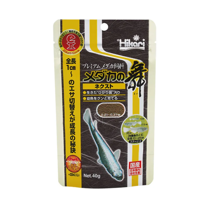 “MEDAKA-NO-MAI NEXT"" is een premiumvoer dat is ontwikkeld voor de Japanse rijstvis (Oryzias latipes) die in het Japans Medaka wordt genoemd. Zorgvuldig geselecteerde ingrediënten bieden een smaakvolle, zachte textuur die de meeste vissen gretig zullen accepteren en het is ook de beste keuze voor vissen die niet veel eten. Voer ""MEDAKA-NO-MAI NEXT"" voor snelle groei, een goede gezondheid en een betere voortplanting.