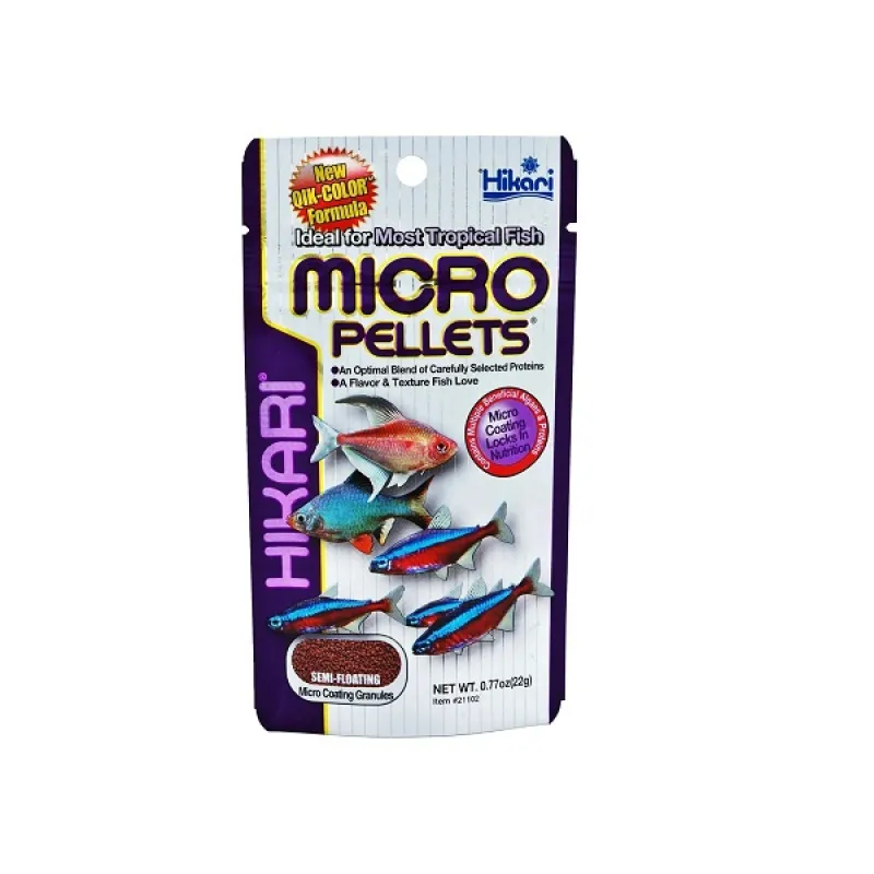 Hikari Micro Pellets zijn unieke zeer kleine korrels voorzien van een coating, speciaal ontwikkeld voor tropische vissen met een kleine bek. De coating zorgt ervoor dat de voedingsstoffen in de korrel blijven en het water niet vertroebelt. De opvallende kleur en zachte textuur maakt het bij uitstek geschikt voor kleinere tropische vissen, waarbij krill en spirulina zorgen voor levendige kleuren. Hikari Micro Pellets zijn het alternatief voor vlokvoer.