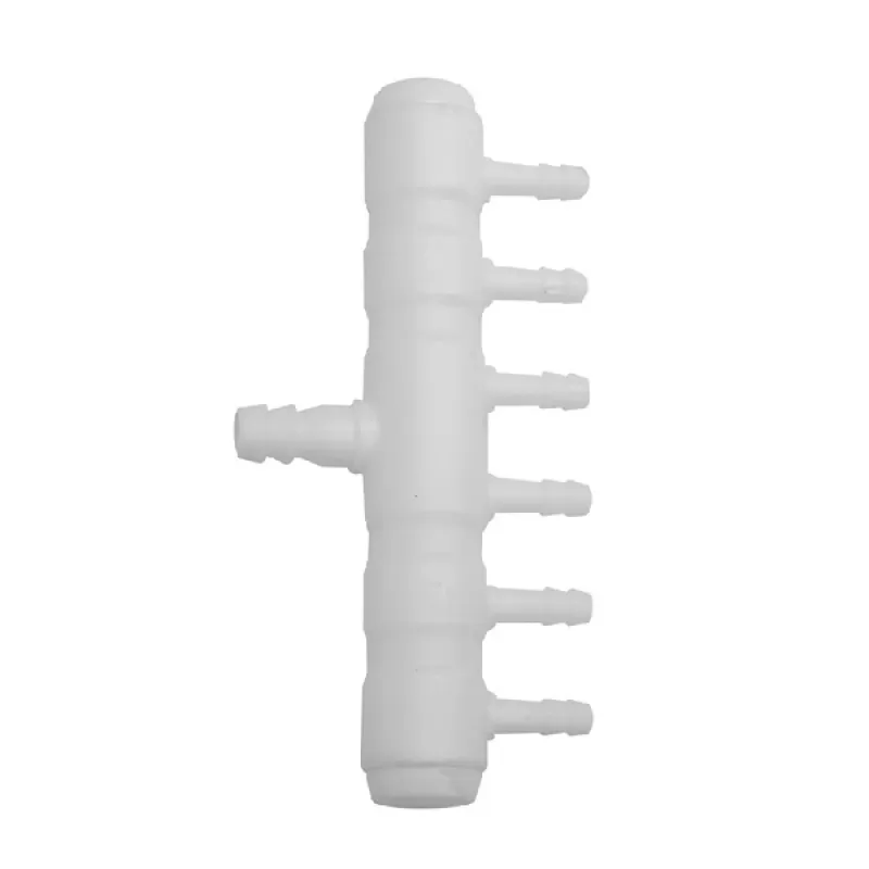 Luchtverdeler van 1x 6 á 8 mm naar 6x standaard luchtslang 4mm. Deze verbinder maakt het makkelijk om meerdere luchtstenen of luchtfilters aan 1 luchtpomp te koppelen.