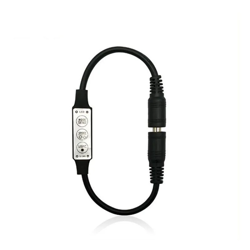 Het aansluiten is heel eenvoudig, plug de dimmer tussen de kabel van de adapter en de LED en schakel de stroom weer in. Met de 3 knoppen kunt u de verlichting inschakelen, uitschakelen of dimmen.
