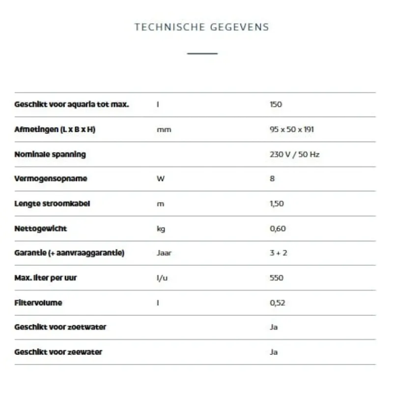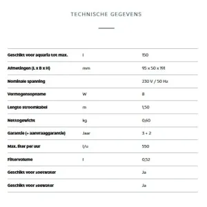 Het EcoFlow 150 binnenfilter reinigt het water in aquaria met een volume tot 150 liter. De geïntegreerde uitstroomnozzles zorgen voor een gelijkmatige oppervlaktebeweging en voldoende zuurstofverrijking. Zowel de stroomrichting als de stroomsnelheid kunnen individueel worden ingesteld. Onderhoud is kinderspel dankzij het filterkamerontwerp met vuilvanger en geïntegreerde magneten. De organische stoffen blijven in de filterkamer en komen niet terug in het aquarium. Zowel de afzonderlijke kamers als het hele filter kunnen worden verwijderd. De maximale doorstroomsnelheid is 550 liter per uur.