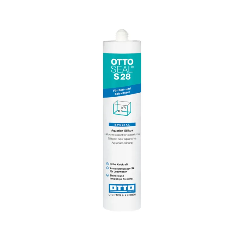 Professionele aquariumsiliconen S28 Otto specifiek ontwikkeld voor het verlijmen van aquaria (zoet en zeewater) en terraria. Tijdens het verlijmen goed ventileren.