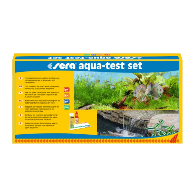 Met de sera aqua-test testset kunnen de voor zoet- en zeewater belangrijke parameters - zuurgraad (pH-waarde), carbonaathardheid (KH), totale hardheid (GH) en nitriet (NO2) - worden bepaald.