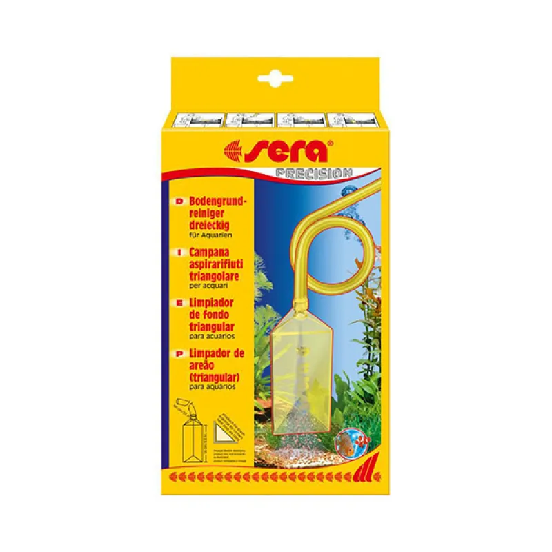 De Sera driehoekige bodemreiniger is geschikt om de bovenlaag van de grindbodem te reinigen. Door de driehoekige vorm zijn ook de hoeken goed te bereiken. De reiniger heeft een lengte van 24 cm en wordt geleverd inclusief 140 cm slang. Door het gebruik van de vuilklok wordt het vuil opgezogen maar de verbreding van de zuigmond is de zuigkracht te klein om ook het grind mee te zuigen. Hierdoor wordt het grind als het ware gewassen in de vuilklok. Dit type reiniger is ideaal om te gebruiken tijdens het waterverversen.