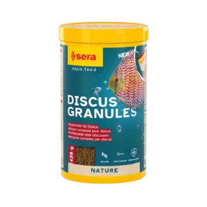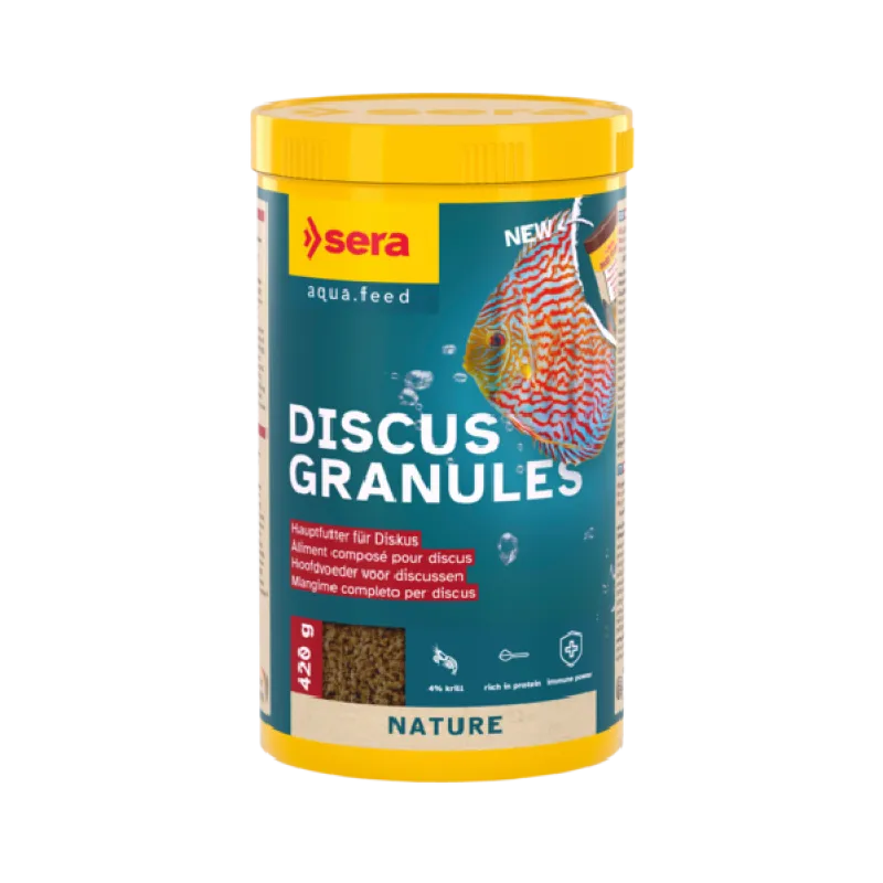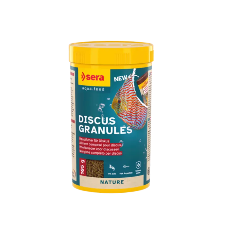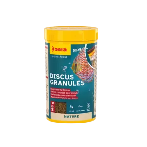 Discus behoren – zoals de volledige naam al doet vermoeden – tot de familie van de cichliden. Ze behoren tot de meest gevoelige siervissoorten in het zoetwateraquarium, die in veel opzichten speciale eisen stellen aan het houden ervan – inclusief hun dieet. Discusvissen zijn kieskeurige vissen die vaak al gewend zijn aan een bepaald soort voeder door het voederen bij de kweker. Met behulp van een langzame omschakeling kunnen ze echter meestal worden overtuigd om andere soorten voeder te proberen. Omdat ze maar een kort spijsverteringskanaal hebben, is het belangrijk dat het voeder – dat slechts spaarzaam gegeven mag worden – niet in de maag opzwelt. Het discusvoeder van sera neemt in het water snel een vlezige consistentie aan, die de discus bijzonder graag eet. Tegelijkertijd zwellen ze niet watervervuilend op. Naast een hoofdvoeder, dat een goede basis voor het voederen van discussen vormt, omvat het sera assortiment discusvoeder ook een kleurvoeder en een groeivoeder.