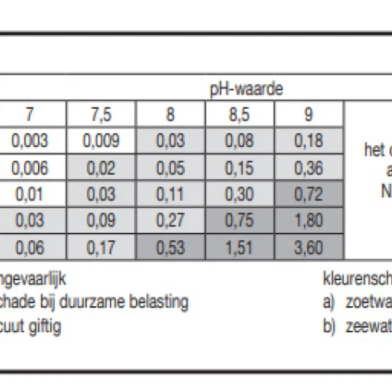 Met de sera NH4/NH3-Test wordt de totale concentratie van beide stoffen bepaald (in de bijgevoegde tabel kun je aan de hand van de pH-waarde het werkelijke ammoniakgehalte vinden).