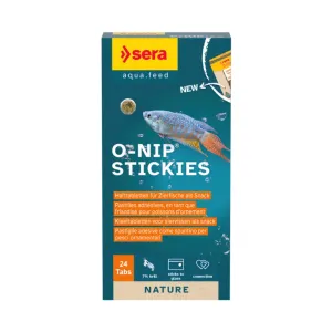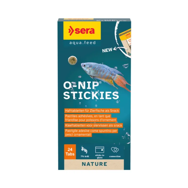 O-Nip Stickies is een lekkernij zonder kleur- en conserveermiddelen, gemaakt van behoedzaam geproduceerde tabletten die met lichte vingerdruk aan de aquariumruit blijven plakken. Dit betekent dat zelfs schuwe vissen gemakkelijk kunnen worden geobserveerd tijdens het voeden.