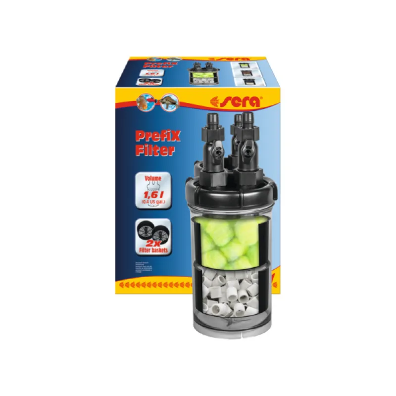 Voor extra voor-, bio- of snelfiltering met bestaande pompen of buitenfilters Met het sera PrefiX Filter kan het filtervolume van een filter dat erachter is aangesloten met twee variabel inzetbare filtermanden tot 1,6 liter worden verhoogd. Het filter zonder aandrijving is geschikt als voorfilter bij vertroebelingen, als snelfilter bij verontreinigingen of als biofilter voor het uitbreiden van de filtercapaciteit van kleine buitenfilters. Met behulp van de slang van 16/22 mm kan het filter aan vrijwel elke pomp of buitenfilter worden aangesloten. Een verbinding van meerdere PrefiX Filter achter elkaar, is ook mogelijk.