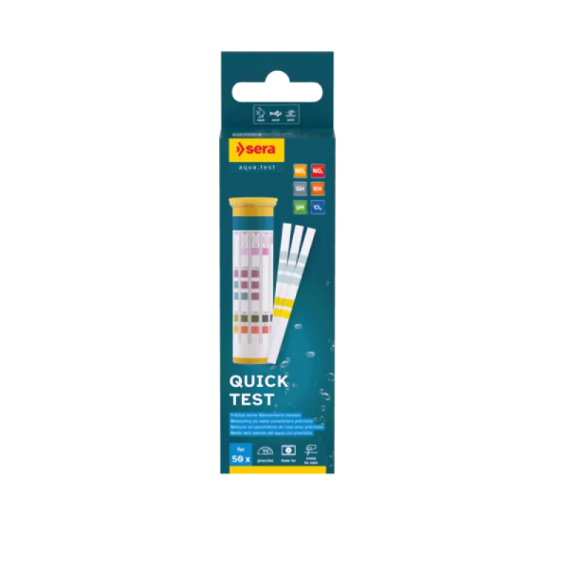 Met de Quick Test biedt sera de optimale mogelijkheid om de belangrijkste waterwaarden (pH-waarde, kH / carbonaathardheid, gH / totale hardheid, NO3 / nitraat, NO2 / nitriet en CL- / chloor) in het aquarium met slechts één teststrookje probleemloos te testen.