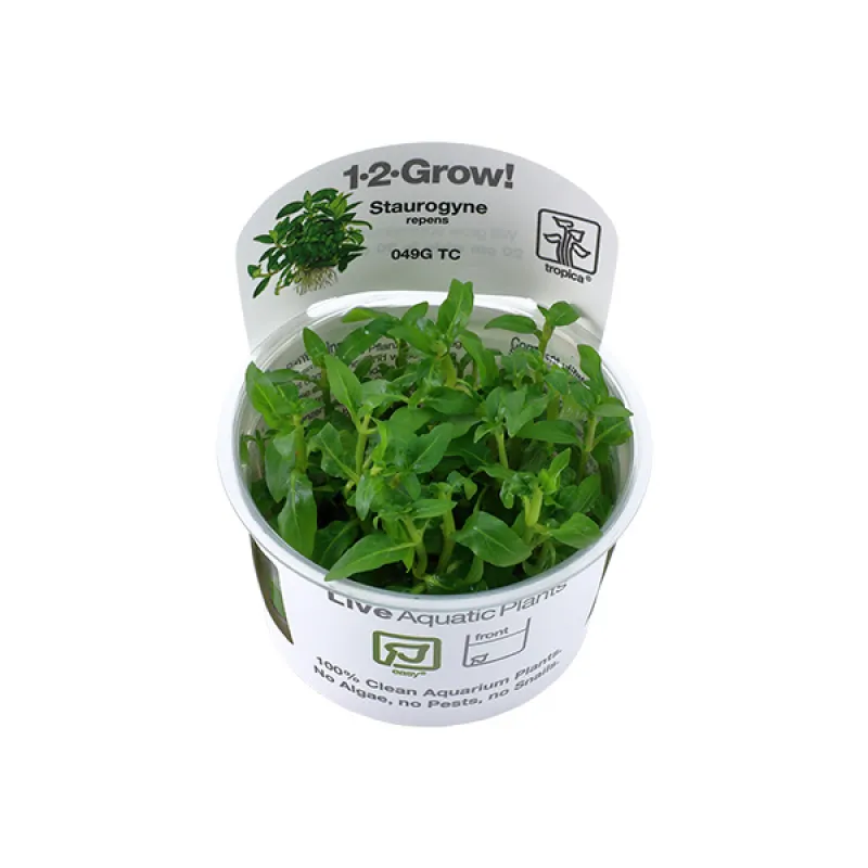 Staurogyne repens is een fris groene sterke en compacte plant. De plant komt uit de Rio Cristalino in het zuiden van het Amazone gebied. Staurogyne groeit compact en bossig en wordt 5-10 cm hoog met kleine blaadjes van ca. 2 cm. Bij het planten is het verstandig om de lange verticale wortels te verwijderen waardoor ze nieuwe horizontale wortels maken. Met weinig licht worden de planten wat langer en minder vol dus goede verlichting is aan te raden.