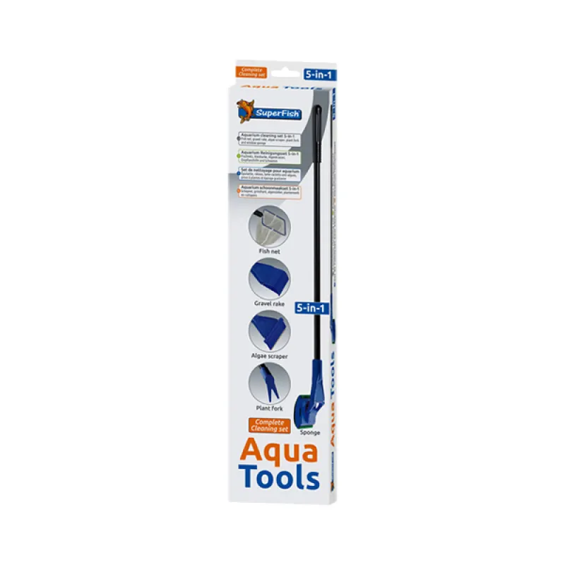 Complete aquarium kit bestaande uit verschillende accessoires zoals een schepnetje, ruitspons, planten vork, grindhark en algenstekers. Voor gemakkelijk onderhoud zonder natte handen! Aqua Tool is een 5-in-1 set voor middelmaat aquaria.