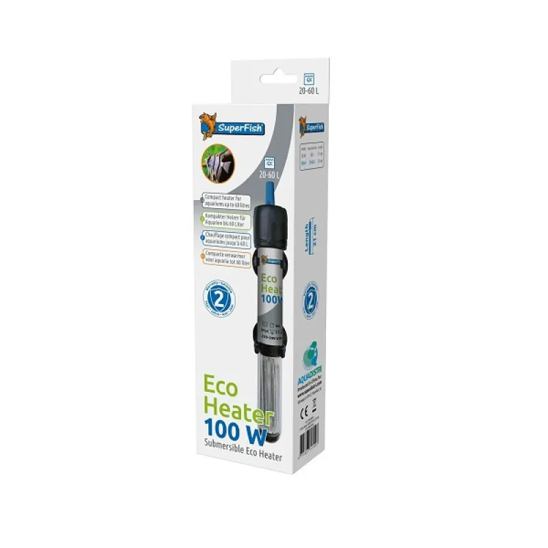 De Eco Heater verwarming 50 en 100 zijn ontworpen voor gebruik in kleine aquaria. De 50 Watt Eco Heater is slechts 17 cm lang en past perfect in de SuperFish Home 8, 15 en 25 en andere kleine aquaria tot 50 liter. De Eco Heater 100 Watt is 21 cm lang en past perfect in de Home 40, 60 en andere aquaria tot 100 liter. De Eco Heaters hebben een betrouwbare thermostaat en extra lange kabel.