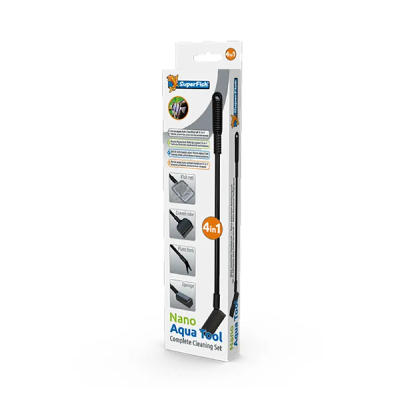 Complete aquarium kits bestaande uit verschillende accessoires zoals een schepnetje, ruitspons, planten vork en grindhark. Voor gemakkelijk onderhoud zonder natte handen! Nano Aqua Tool is een 4-in-1 set voor kleine aquaria.
