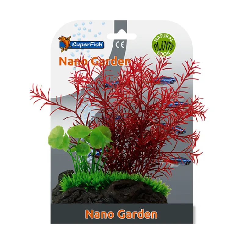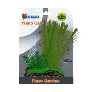 Klein kunstmatig tuintje met 3 soorten planten op drijfhout. De Nano Wood Garden hebben een slangaansluiting en luchtsteen voor een luchtpomp.
