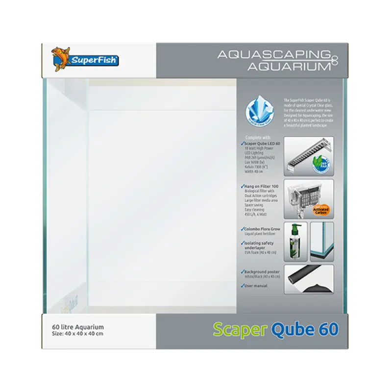 Compacte startset om kennis te maken met de wereld van het aquascapen. De sets worden geleverd inclusief Superfish Qube Led, Hang on Filter, Colombo Flora grow plantenvoeding, Veiligheids EVA-foam en Posterachterwand (zwart/wit).