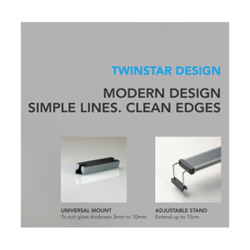 De twinstar B-line is een nieuwe betaalbare lijn LED-verlichting speciaal ontwikkeld voor een optimale kleurweergave van vissen en garnalen. Dit wordt bereikt door het gebruik van een deel geprogrammeerde RGB LED's in combinatie met de witte LED's. De meegeleverde uitschuifbare beugels geven een marge van ca. 15 cm. Ze passen op een glasdikte van 3 tot 10 mm dik. De gemiddelde kleurtemperatuur is 7500 K.
